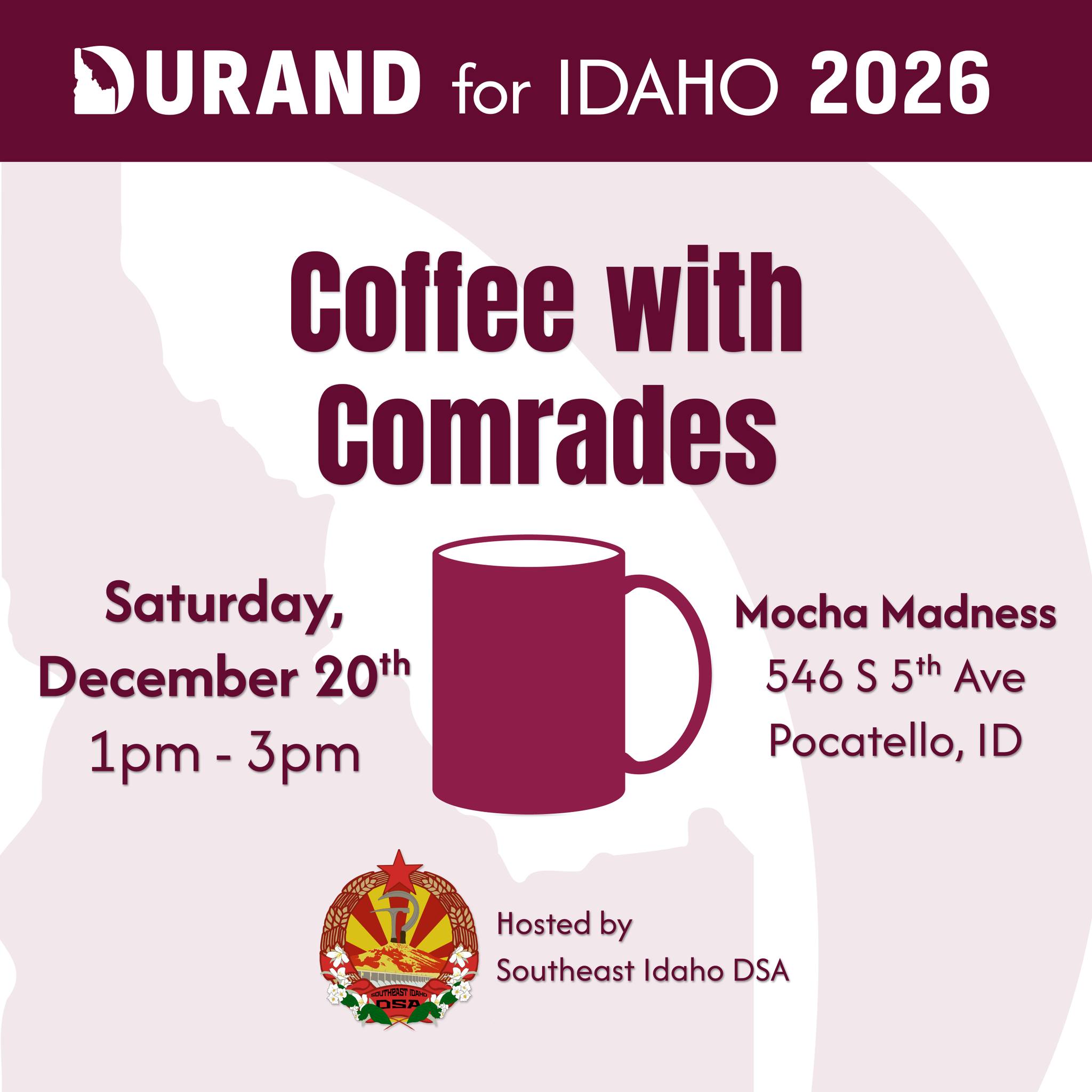 Meet Maxine Durand, Independent candidate for governor of Idaho, over a cup of coffee and have a conversation with the gubernatorial candidate!